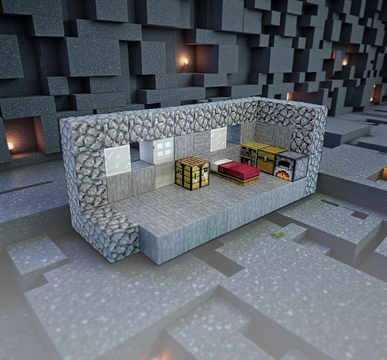 Indeholder ovn, seng, crafting table, bogreol, kister og dør.